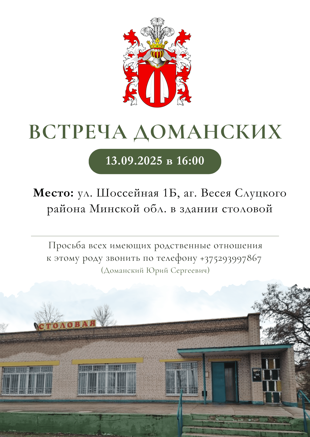 13 сентября в агрогородке Весея Слуцкого района прошёл вечер встречи представителей рода Доманских. Инициатором и организатором этого события стал Юрий Сергеевич Доманский.